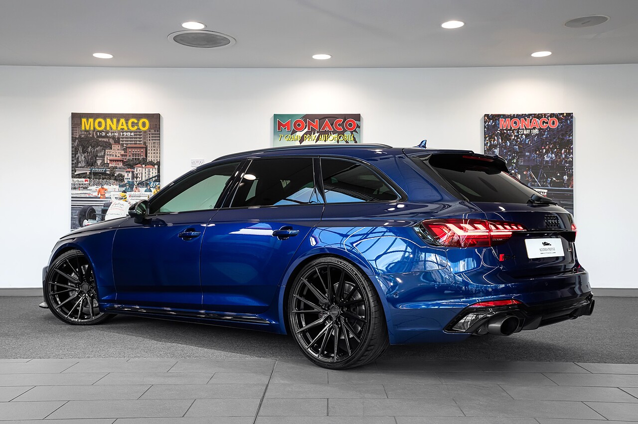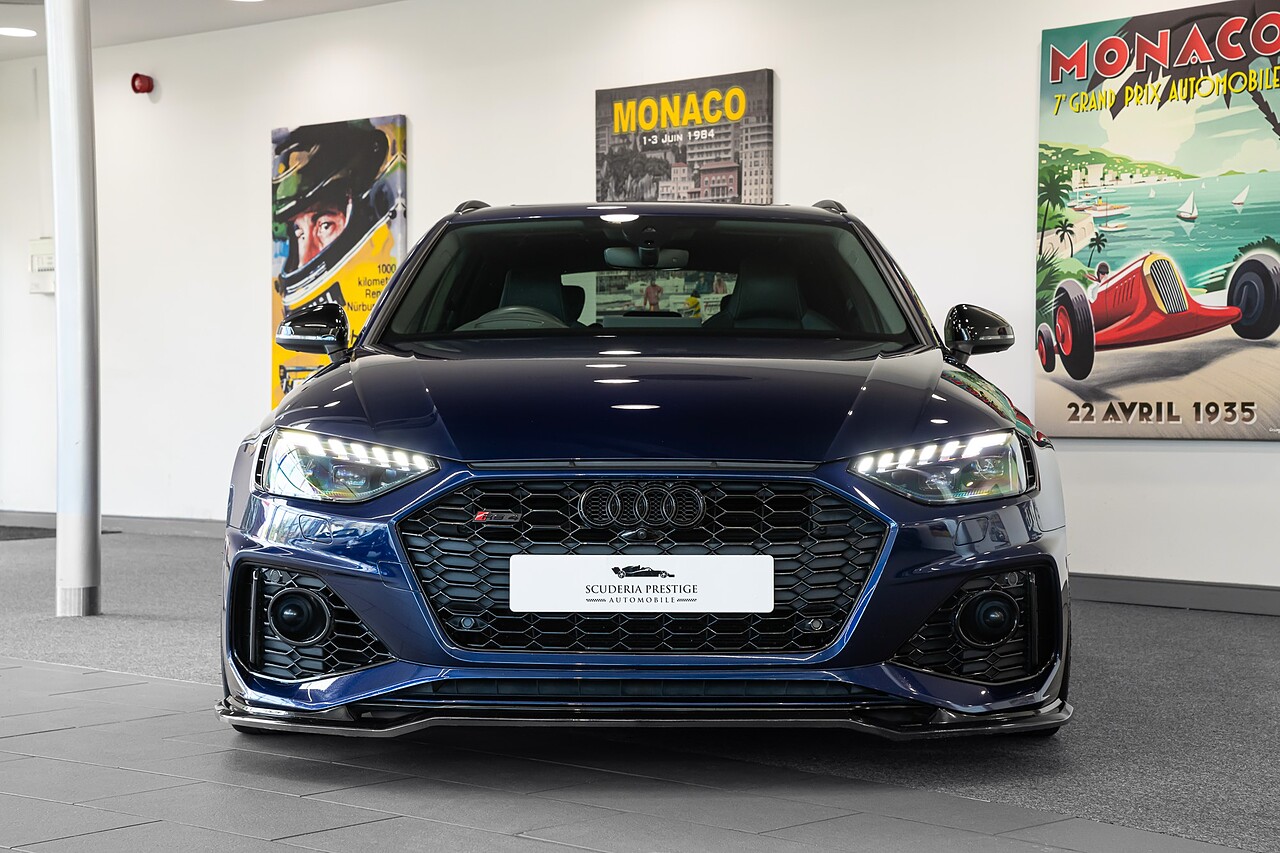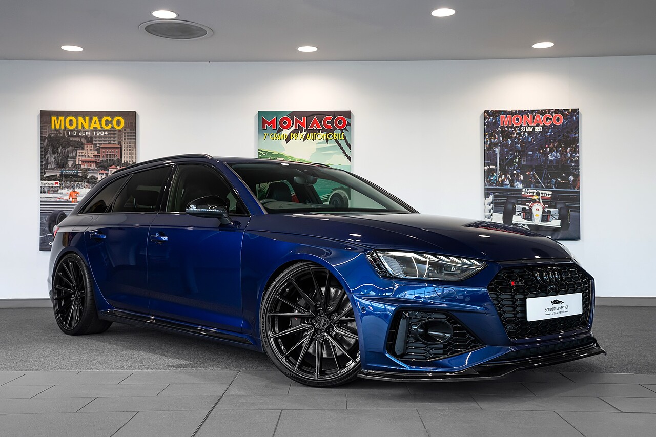 2020 (20 Reg) Audi RS4 Avant Vorsprung | Finished in Navarra Blue Metallic with Black Fine Nappa Leather Interior with Rock Grey Honeycomb Contrast Stitching | 21inch Vossen Hybrid Forged Series HF-4T Wheels in Gloss Black | Full Milltek Non Resonated Exhaust System with Black Tips | Milltek Cat-less Downpipes | Milltek Mid Box | MSS Adjustable Springs | QST Stage 2 ECU TCU Combo | Wagner Charge Cooler System | 034 Motorsports Brake Upgrade | Eventuri Intake System | Dark Ghost Gloss Black Front Splitter | Top Speed Limiter Raised to 174MPH | Panoramic Glass Sunroof | RS Sports Suspension Plus | Pneumatic Massage Function | Head-Up Display | Bang & Olufsen 3D Sound System | Seat Heater for Front and Rear Seats Separately Controlled | Driver Assistance Pack-Tour | Parking Assistance Package | Park Assist | Front and Rear-View Camera System with Two Side Cameras | Sports Package | Extended Interior LED Light Package | Dynamic Steering | Keyless Entry System | Black Styling Package with Black Rings | Black Exterior Mirror Housings | Black Roof Rails | Large Front Spoiler | Traffic Sign Recognition | Adaptive Cruise Control with Speed Limiter | Lane Keeping System | Piano Black Interior Inlays.