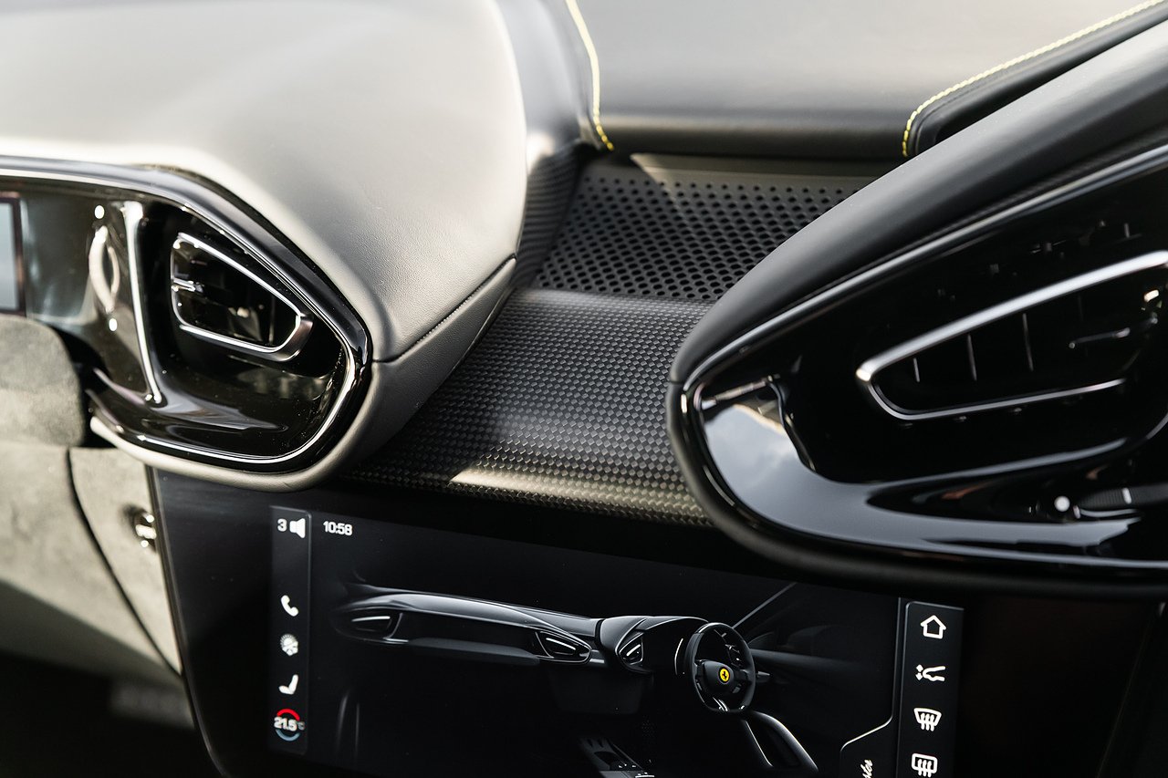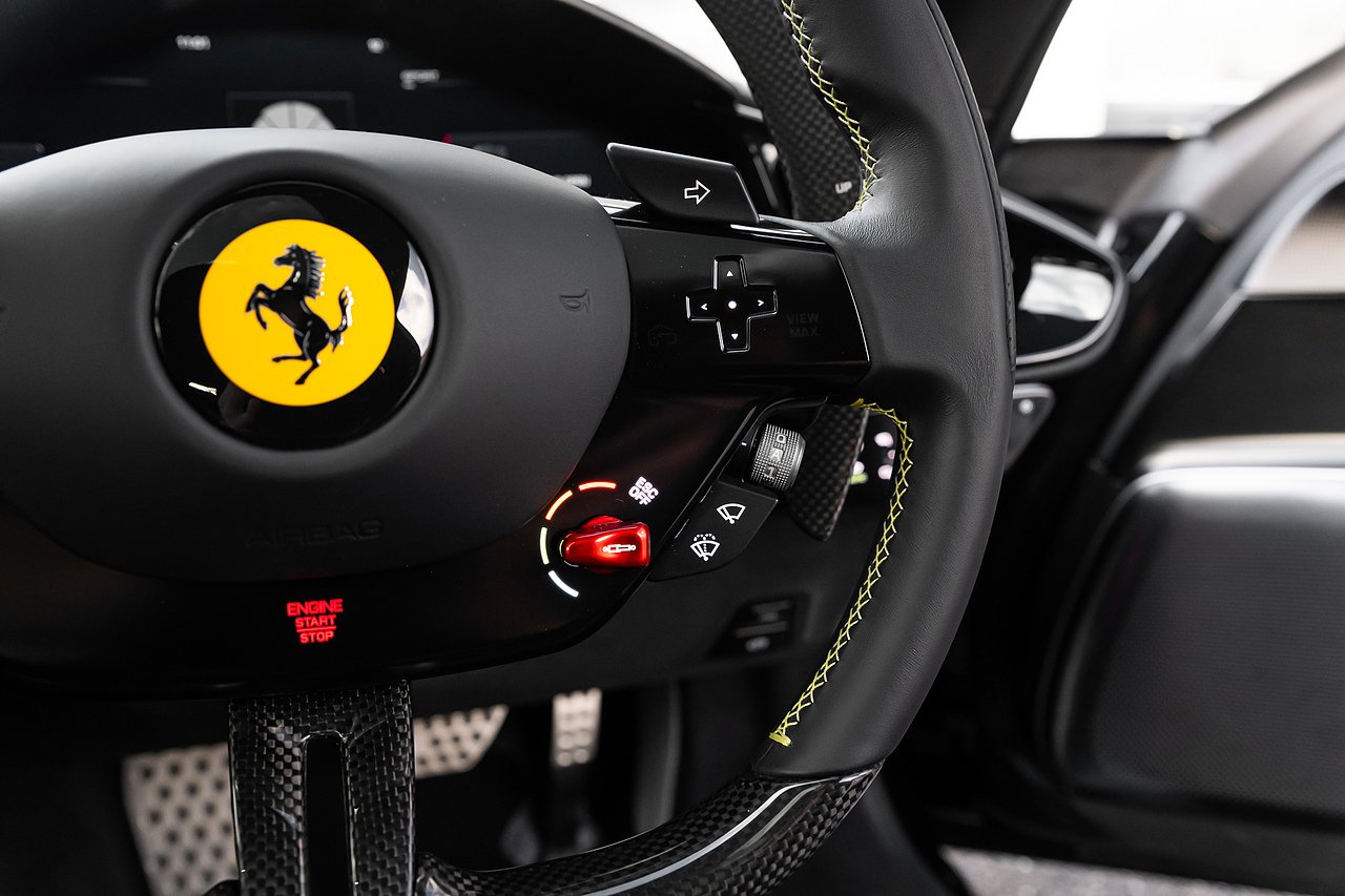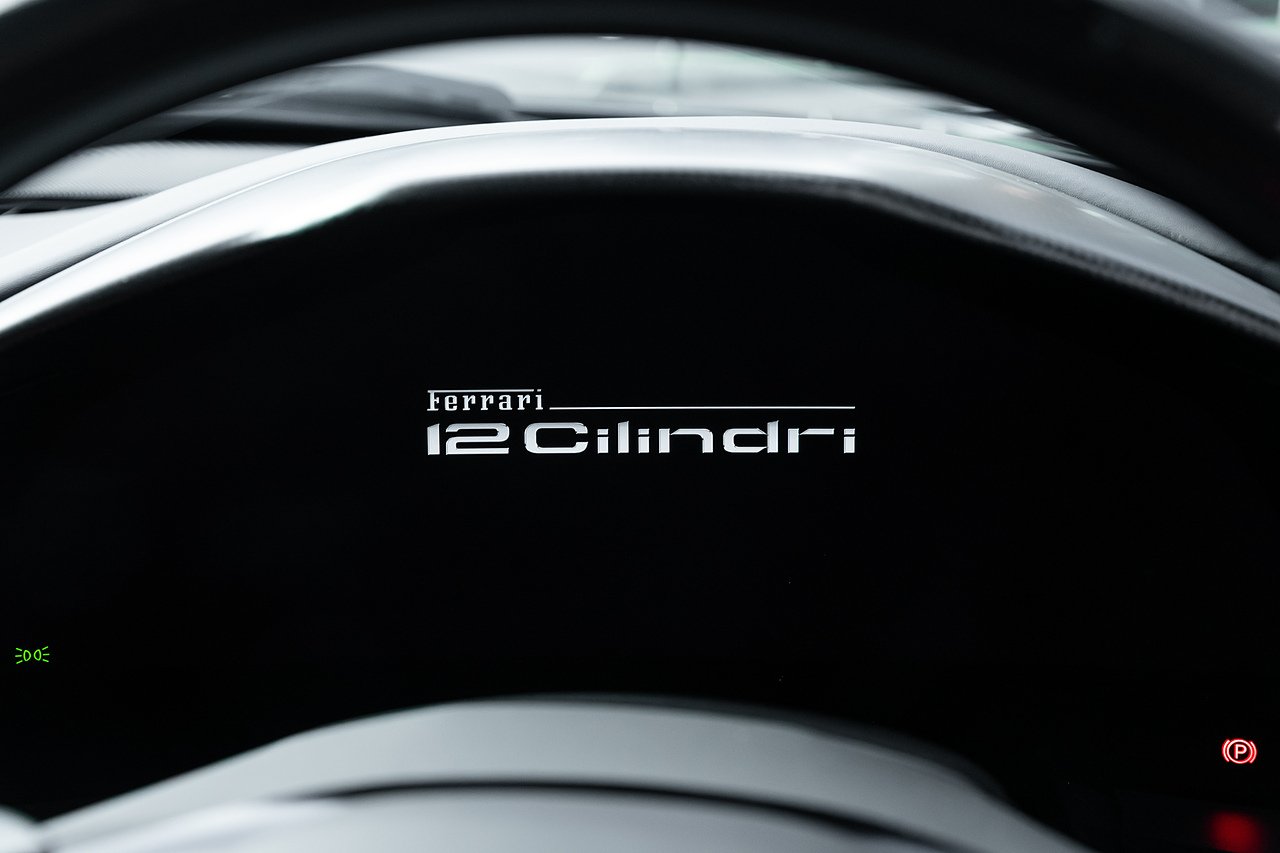 2024 (74 Reg) Ferrari 12Cilindri V12 | Finished in Extra-Range Classic Nero Daytona with Nero Alcantara and Leather Interior | 21inch Glossy Black Diamond Cut Finish Rims with Yellow Brake Calipers | Rear Diffuser in Carbon Fibre | Carbon Fibre Front Air Intakes | Carbon Fibre Underdoor Cover | Carbon Fibre Instrument Cover | Carbon Fibre Door Panels | Carbon Fibre External Kickplate | Upper Part of Centre Console in Carbon Fibre | Carbon Fibre Front Spoiler | Carbon Fibre Steering Wheel + LEDS | Panoramic Roof | Front Lift | Passenger Display | High-End Audio System | Electric Tailgate | Scuderia Ferrari Shields | Aluminium Driver + Passenger Footrest | Full Electric Seats | Smartphone Interface | Wireless Smartphone Charger | Active Matrix LED Headlights | Nero DS Two-Tone Body Painting | Giallo Cavallino Embroidered on Headrests | Giallo Coloured Special Stitching | Front Radar with ACC | Back Radar | Emergency Call | SVR Anti-Theft System with Card | Wheel Stud Bolts in Titanium.