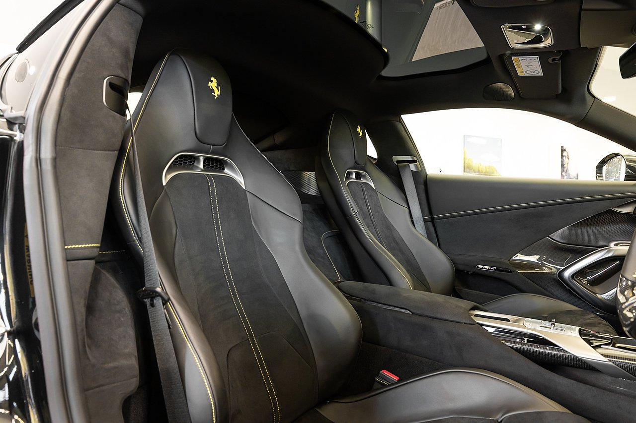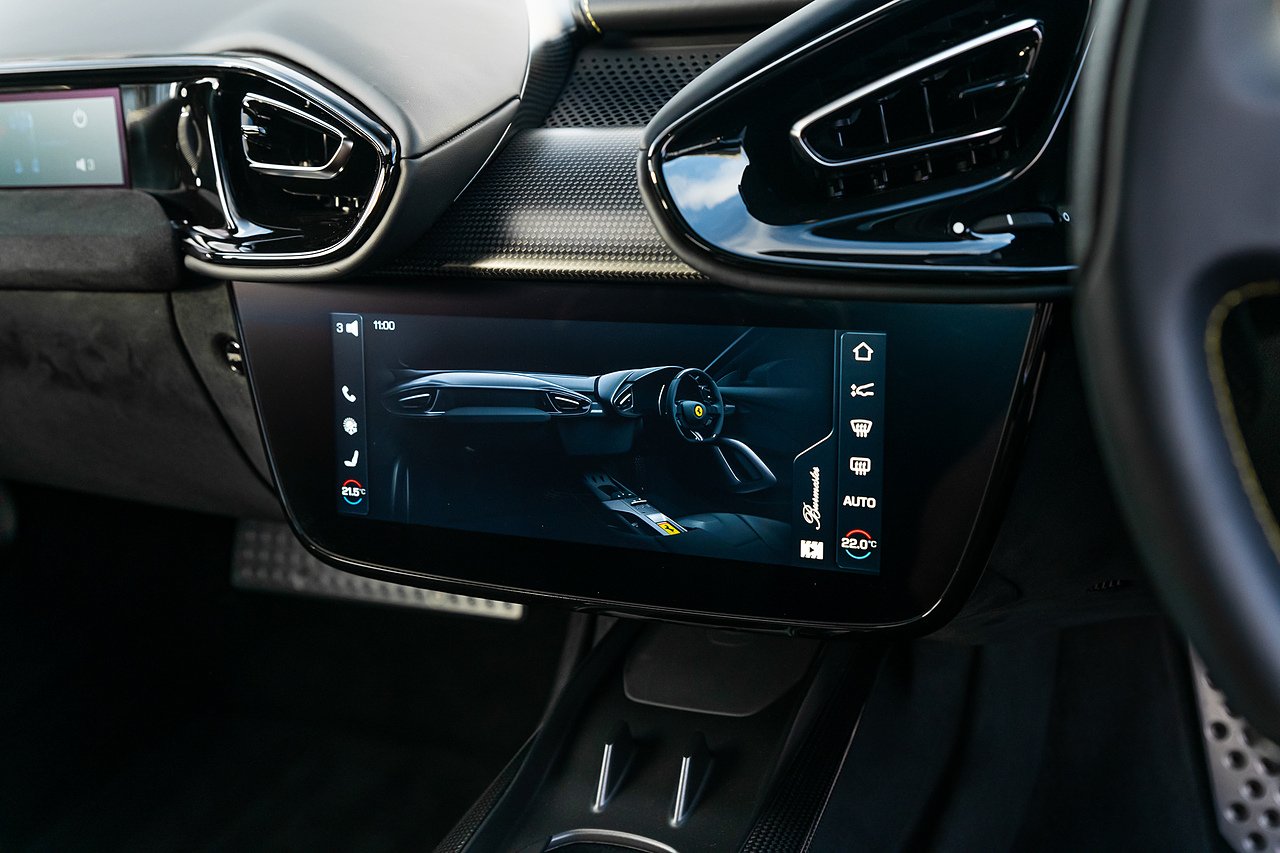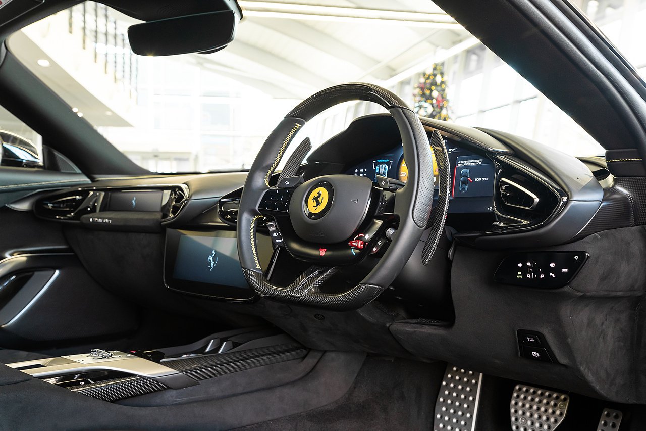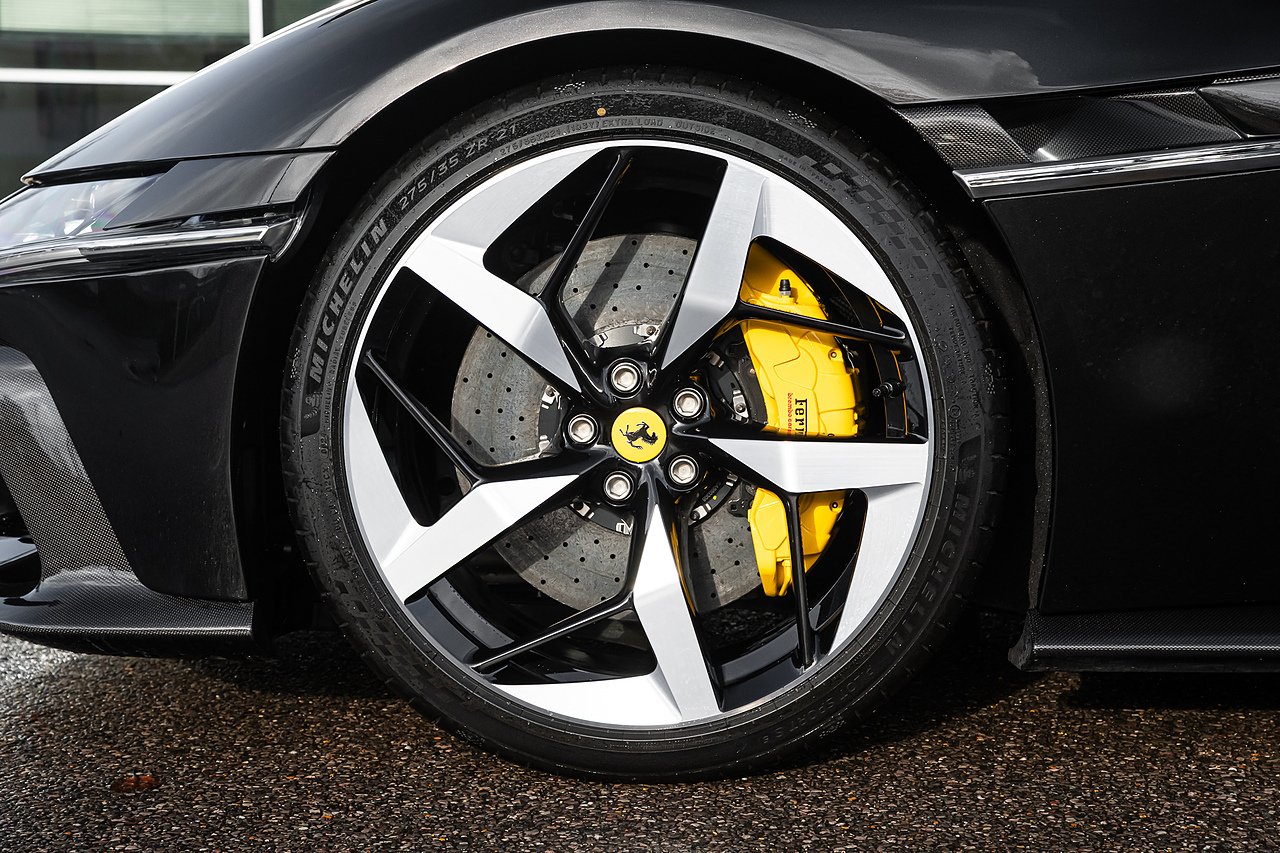 2024 (74 Reg) Ferrari 12Cilindri V12 | Finished in Extra-Range Classic Nero Daytona with Nero Alcantara and Leather Interior | 21inch Glossy Black Diamond Cut Finish Rims with Yellow Brake Calipers | Rear Diffuser in Carbon Fibre | Carbon Fibre Front Air Intakes | Carbon Fibre Underdoor Cover | Carbon Fibre Instrument Cover | Carbon Fibre Door Panels | Carbon Fibre External Kickplate | Upper Part of Centre Console in Carbon Fibre | Carbon Fibre Front Spoiler | Carbon Fibre Steering Wheel + LEDS | Panoramic Roof | Front Lift | Passenger Display | High-End Audio System | Electric Tailgate | Scuderia Ferrari Shields | Aluminium Driver + Passenger Footrest | Full Electric Seats | Smartphone Interface | Wireless Smartphone Charger | Active Matrix LED Headlights | Nero DS Two-Tone Body Painting | Giallo Cavallino Embroidered on Headrests | Giallo Coloured Special Stitching | Front Radar with ACC | Back Radar | Emergency Call | SVR Anti-Theft System with Card | Wheel Stud Bolts in Titanium.