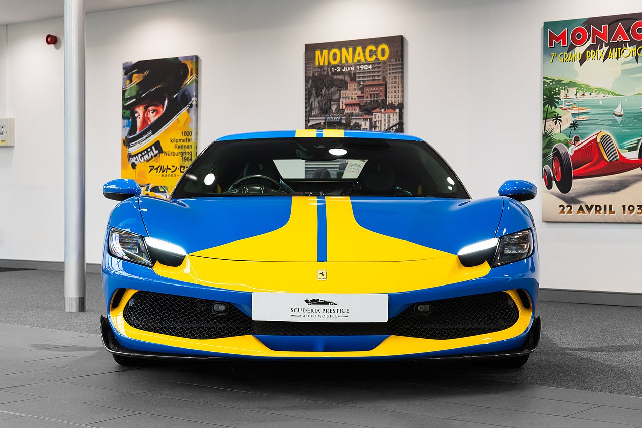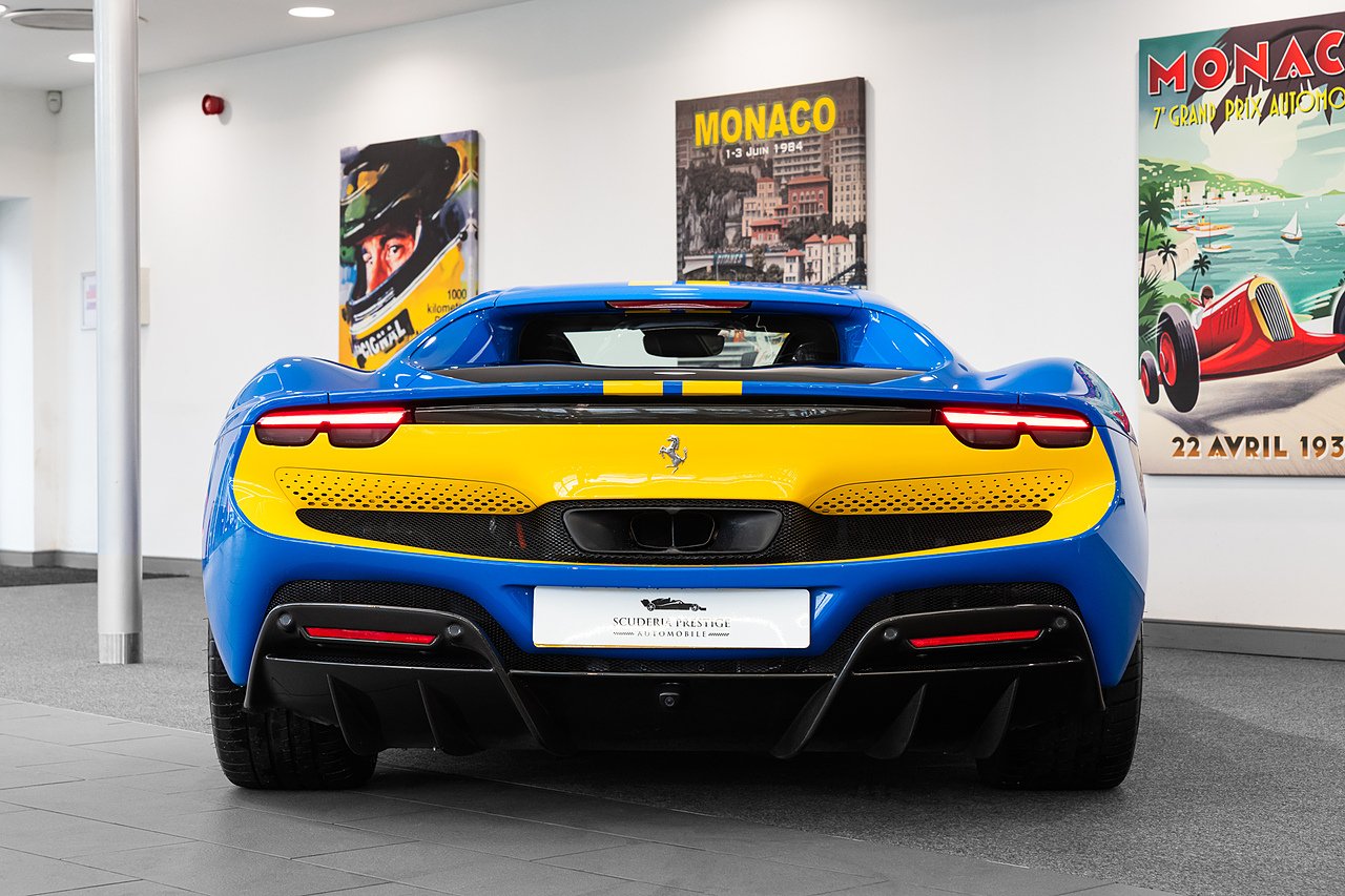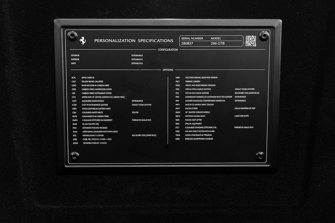 2022 (22 Reg) Ferrari 296 GTB | Finished in Extra-Range Azzurro Dino with Blu Scuro Vintage Range Leather Interior | 20inch Painted Forged Wheels | Giallo Brake Calipers | Extended Fiorano Package | Match-To-Sample Paint Colour | Giallo Modena DS Racing Stripe | Rear Diffuser in Carbon Fibre | Carbon Fibre Underdoor Cover | Carbon Fibre Instrument Cover | Upper Part of Centre Console in Carbon Fibre | Dash Inserts in Carbon Fibre | Carbon Fibre Steering Wheel + LEDS | Parking Camera | Front and Rear Parking Sensors | Daytona Racing Seats (Large Size) | Apple CarPlay | Black Tailpipe Tips | Scuderia Ferrari Shields | Electrochromic Rear-View Mirror | Racing Seat Lifter | Special Equipment | Wheel Stud Bolts in Titanium | Wireless Smartphone Charger | PIPO in Giallo Extra-Range Leather | PIP7 in Blu Scuro Old-Range Leather | Extra-Range Coloured Inner Details | CLDT in Giallo Extra Range Leather | Stile4 Leather/Alcantara Mats | Yellow Coloured Safety Belts | Giallo Cavallino Stitched on Headrests | Additional Coloured Mats with Logo | Dashboard Webbing in Customer Selected Extra-Range Leather | Passenger Compartment Inserts in Extra-Range Leather | Giallo Coloured Standard Stitching | SVR anti-Theft System with Card.