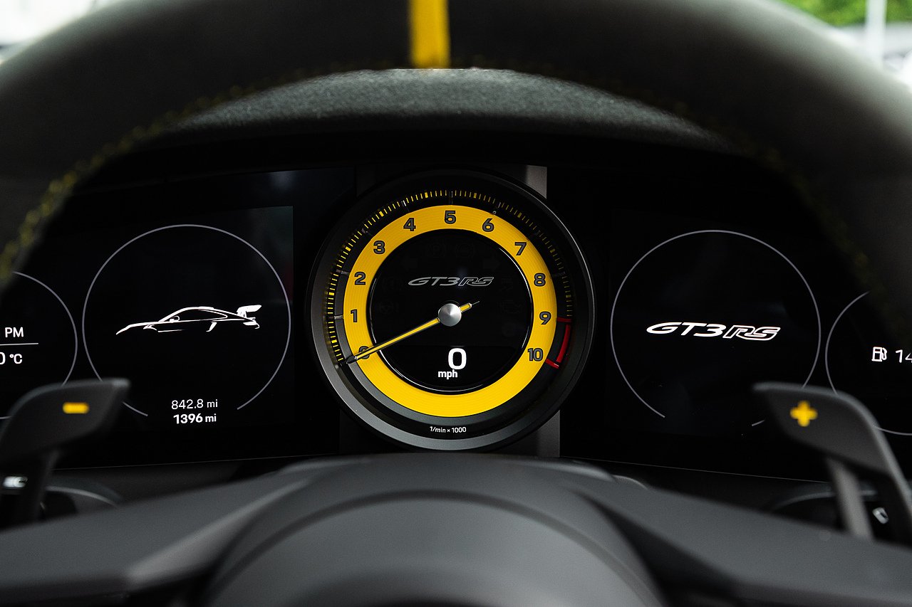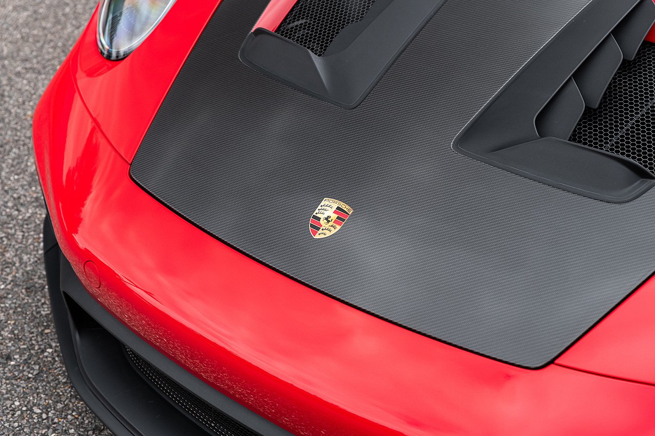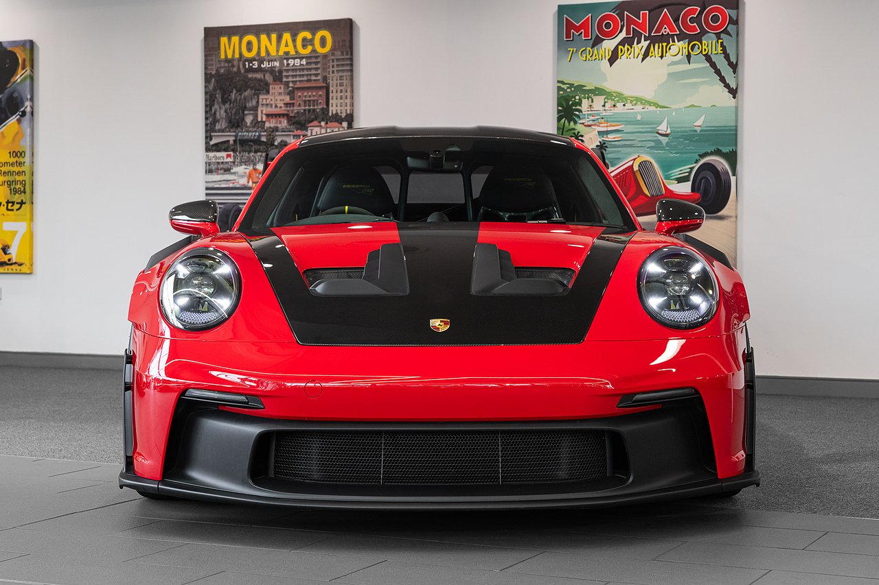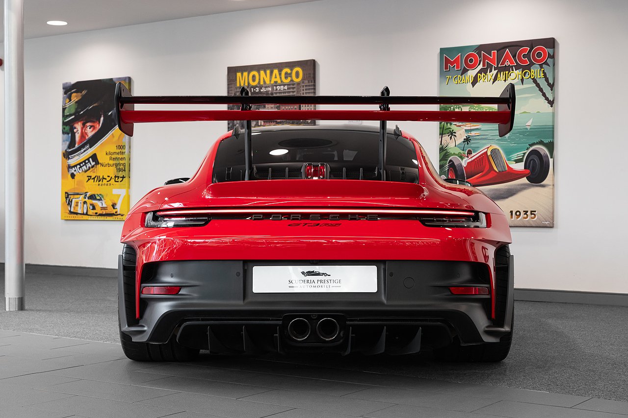 2023 (23 Reg) Porsche 911 992 GT3RS PDK | Finished in Guards Red with Black Leather and Race Tex Interior with Racing Yellow Contrast Stitching | 20inch Front 21inch Rear GT3RS Forged Magnesium Lightweight Wheels Painted in Satin Black | Porsche Ceramic Composite Brakes (PCCB) with Yellow Painted Brake Calipers | Weissach Package | Front Axle Lift System | ClubSport Package with Additional Road Legal 1KG Fire Extinguisher | Roll Cage in Carbon Fibre | Lightweight Carbon Fibre Roof | Front Lid in Visible Carbon Fibre | Carbon Silk Gloss Decorative Inserts | Exterior Mirror Upper Trims in Carbon Fibre | Door Sill Guards in Carbon Fibre | Sport Chrono Package including Mode Switch | Carbon Fibre Full Bucket Seats | BOSE Surround Sound System | Sports Exhaust System in Black | ParkAssist Rear Including Reversing Camera | Apple CarPlay | Tinted LED Main Headlights with Matrix Beam including Porsche Dynamic Light System Plus (PDLS Plus) | Door Opening Loops in Black | Interior Trim Package with Decorative Stitching and Embroidery in Contrasting Colour | Rev Counter in Racing Yellow | Floor Mats in Carbon with Leather Edging | Vehicle Key Painted with Key Pouch in Leather | Seat Belts in Racing Yellow | Chrono Stopwatch Instrument Dial in Racing Yellow | Privacy Glass | PASM Sports Suspension (10mm) Lowered | Power Steering Plus.